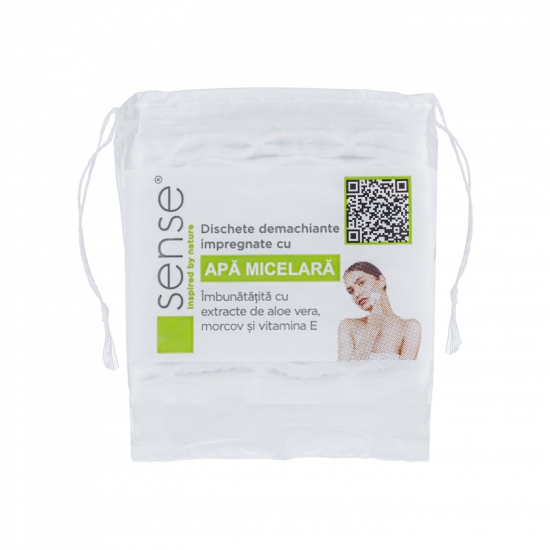 Dischete demachiante Sense cu apă micelară, 20 buc/pachet, pentru curățare delicată și eficientă a tenului.